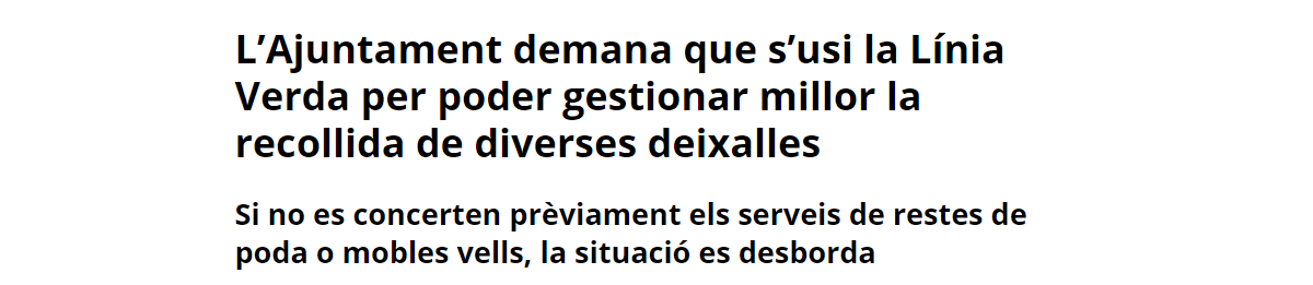 Segons García, “aquesta desproporció ens fa anar de corcoll. Si saps què has de recollir envies un vehicle o un altre. En el cas de l’exemple hi va anar un vehicle petit, però es va acabar passant el dia anant i tornant a buidar, perquè els vehicles més grans ja tenien assignades altres tasques. Aquests viatges van ser innecessaris i improductius”. El regidor recorda també que no n’hi ha prou amb deixar la vegetació o els mobles al costat dels contenidors, perquè els sistemes i horaris de recollida són diferents.